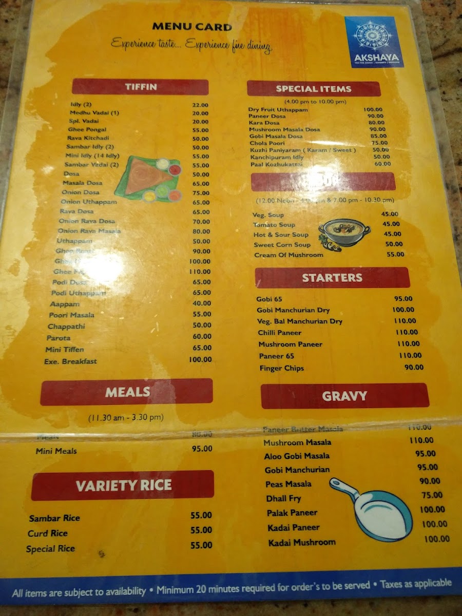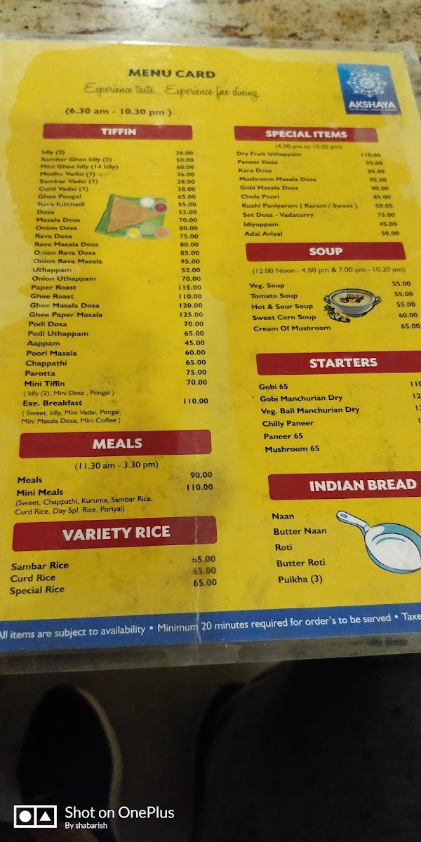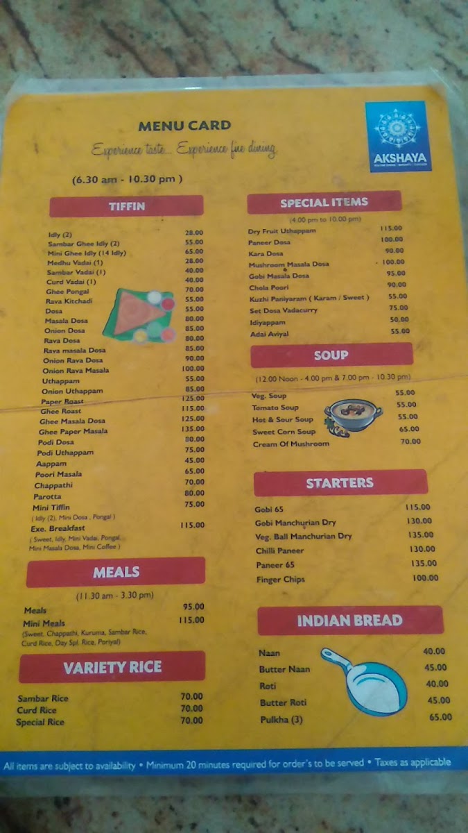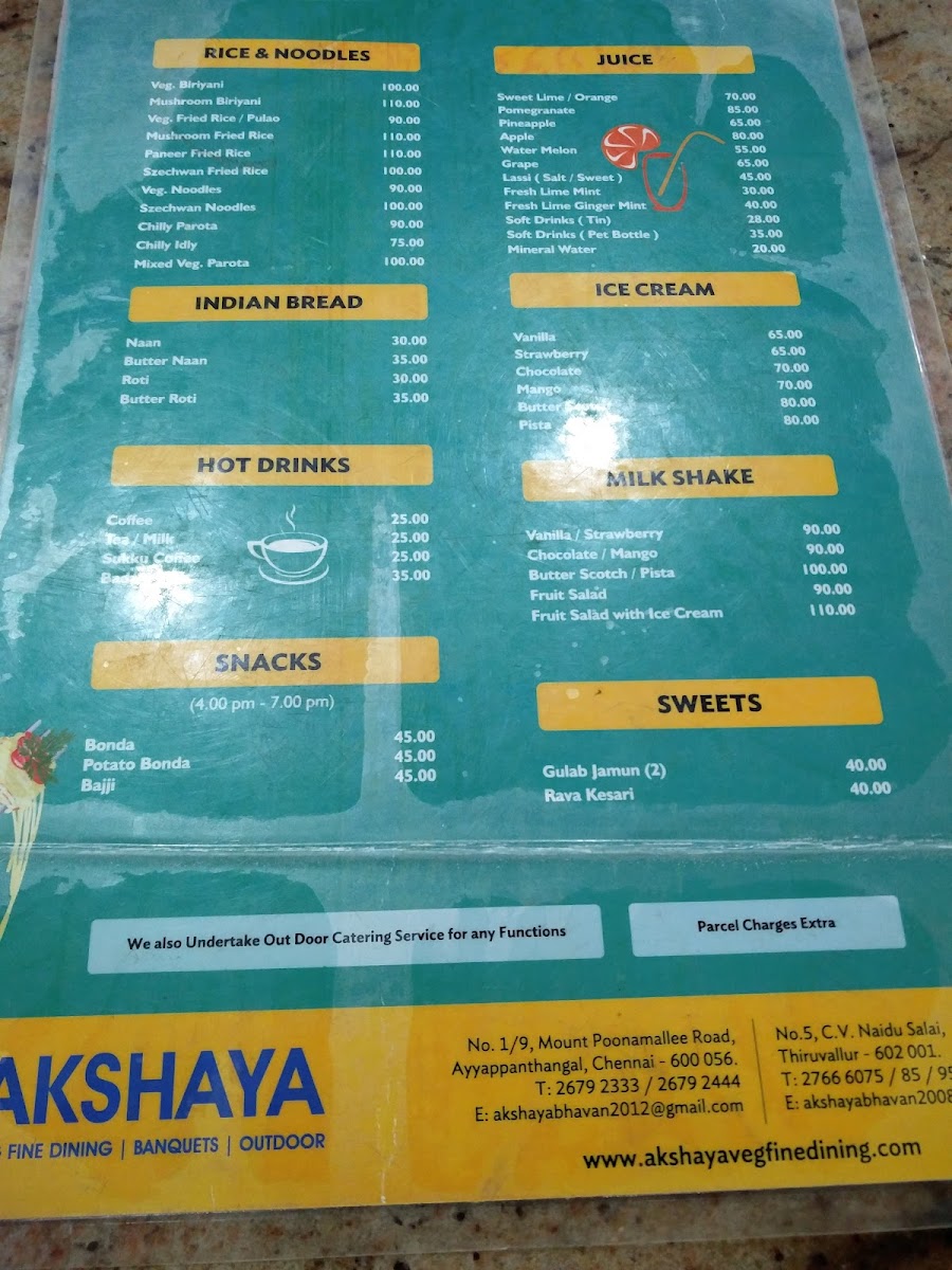 Welcome to Akshaya Bhavan, a delightful South Indian restaurant located at Mount Poonamallee Rd in Chennai. This eatery offers a spacious A/C dining hall, perfect for families and gatherings. The menu showcases a variety of authentic dishes, including the much-loved Mysore Masal and Podi onion Uthappam, which have received rave reviews for their delicious flavors and quality. Patrons like Uma Ramanan and Pavithra Suresh commend the tasty food, though some have noted that service can be a bit delayed at times.